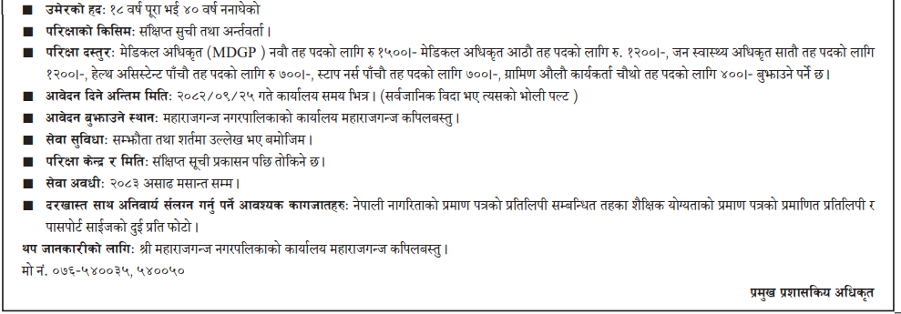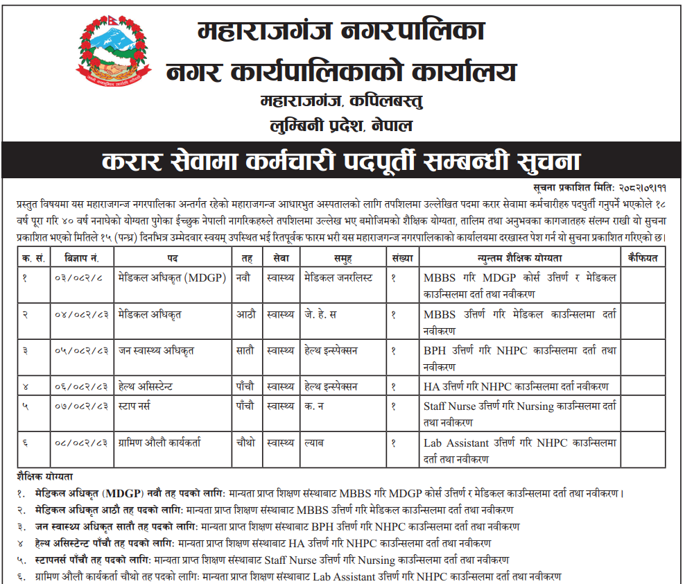 Staff Nurse, Health Assistant, Public Health Officer, Medical Officer Full Time Kapilvastu Posted 3 months ago Applications have closed Website Maharajgunj Nagarpalika JOB OPPORTUNITY Tagged as: Kapilvastu