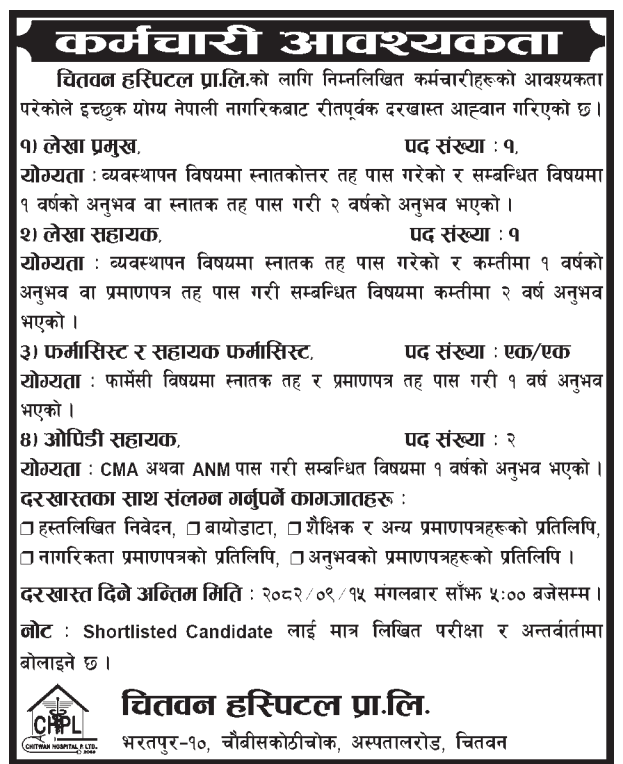 Account Head, Account Assistant, Pharmacist and Assistant Pharmacist, OPD Assistant