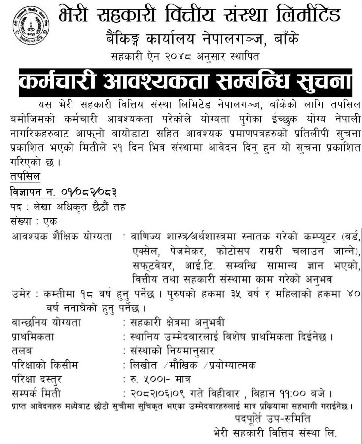 Account Officer Full Time Banke Posted 3 weeks ago Bheri Cooperative Finance Organisation Ltd JOB OPPORTUNITY Position: Account Officer No. of Vacancy: 1 Location: Nepalgunj, Banke Bheri Cooperative Finance Organisation Ltd Tagged as: Banke
