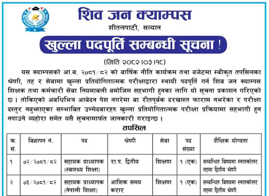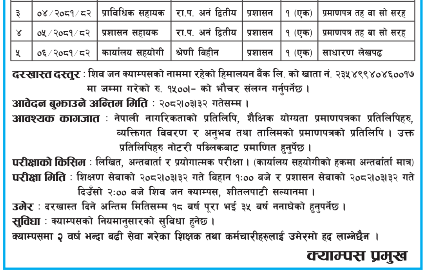 Administration Assistant, Technical Assistant, Assistant Professor, Office Helper Full Time Salyan Posted 4 months ago Applications have closed Shiva Jan Campus JOB OPPORTUNITY Tagged as: Salyan