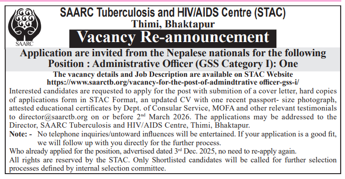 Interested candidates are requested to apply for the post with submition of a cover letter, hard copies of applications form in STAC Format, an updated CV with one recent passport size photograph, attested educational certificates b Dept. of Consular Service, MOFA and other relevant testimonials to director@saarctb.org on or before 2nd March 2026. The applications may be addressed to the Director, SAARC Tuberculosis and HIV/AIDS Centre, Thimi, Bhaktapur.