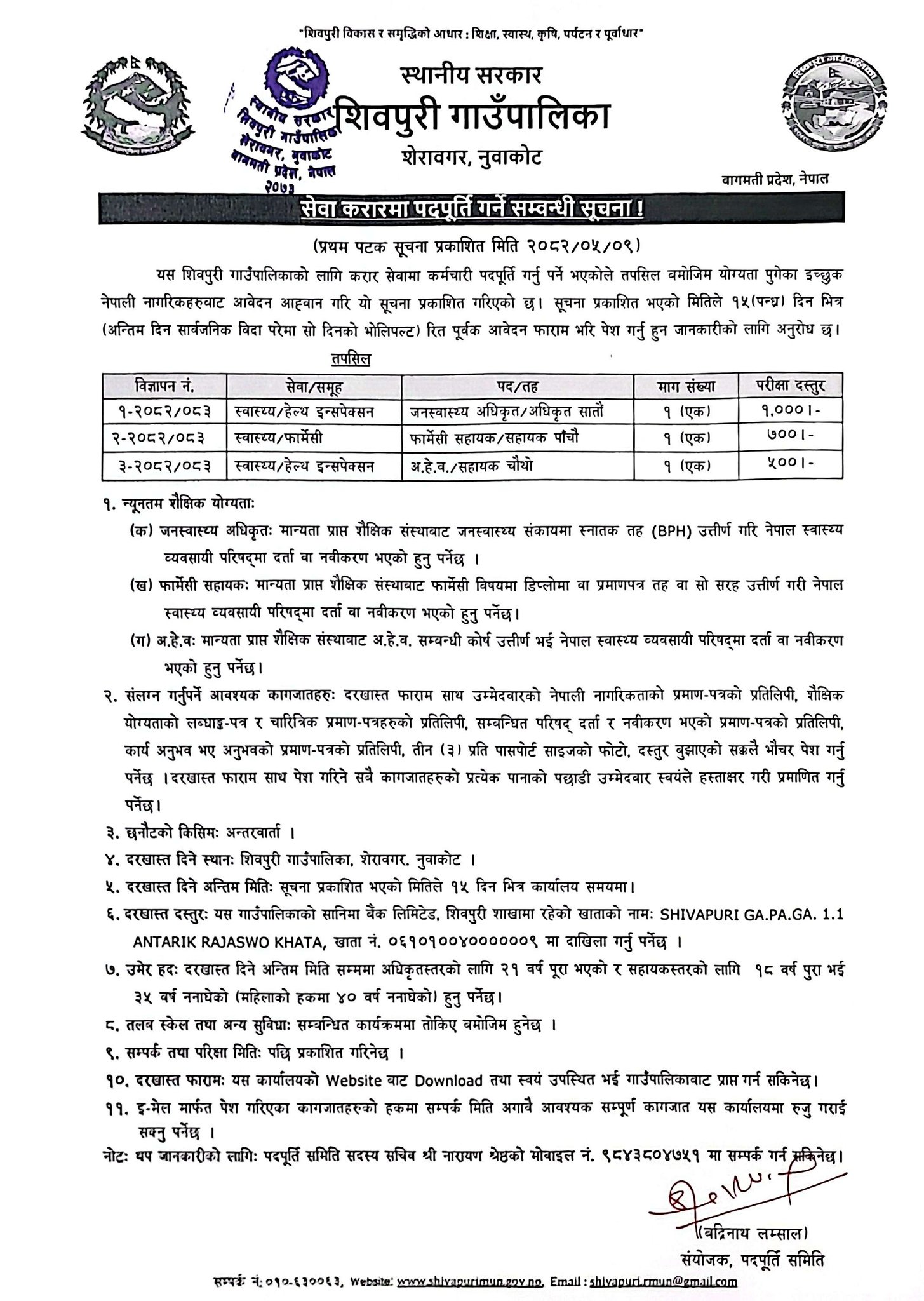 AHW, Pharmacy Assistant, Public Health Officer Full Time Nuwakot Posted 1 month ago Applications have closed Shivapuri Gaunpalika JOB OPPORTUNITY Position: Public Health Officer No. of Vacancy: 1 Position: Pharmacy Assistant No. of Vacancy: 1 Position: AHW No. of Vacancy: 1 Location: Nuwakot Shivapuri Gaunpalika Phone No.: 9843804751 Tagged as: Nuwakot