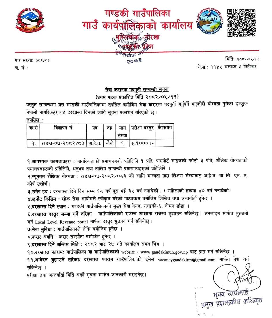 AHW Full Time Gorkha Posted 1 month ago Applications have closed Website Bandipur Gaunpalika JOB OPPORTUNITY Position: AHW No. of Vacancy: 1 Location: Gorkha Bandipur Gaunpalika Email: vacancygandakirm@gmail.com Website: www.gandakimun.gov.np Tagged as: Gorkha