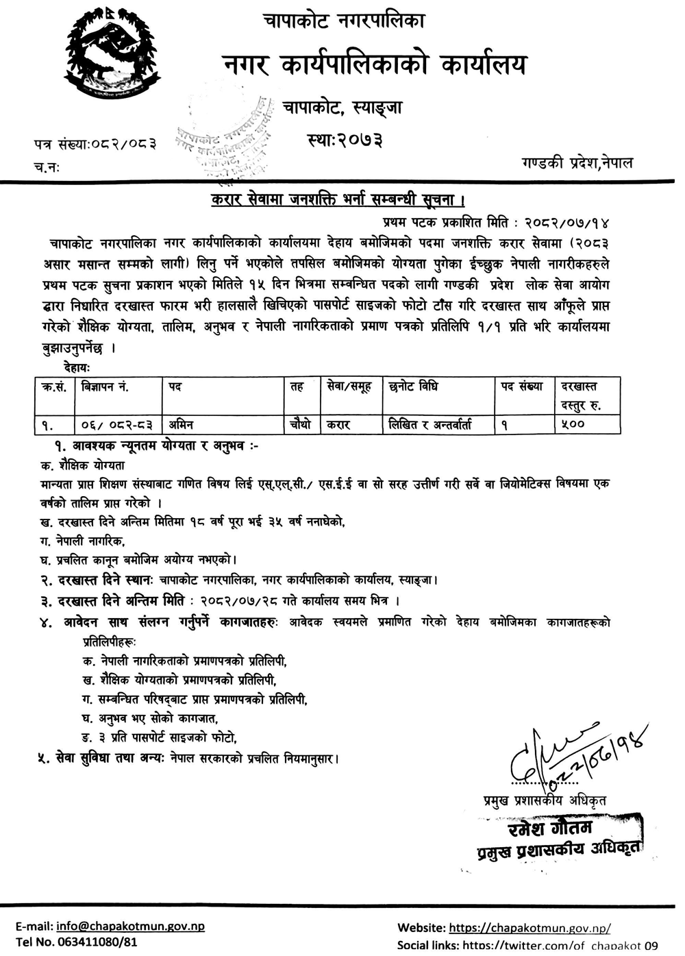 Amin Full Time Syangja Posted 2 weeks ago Applications have closed Website Chapakot Nagarpalika JOB OPPORTUNITY Position: Amin No. of Vacancy: 1 Location: Syangja Chapakot Nagarpalika Tagged as: Syangja