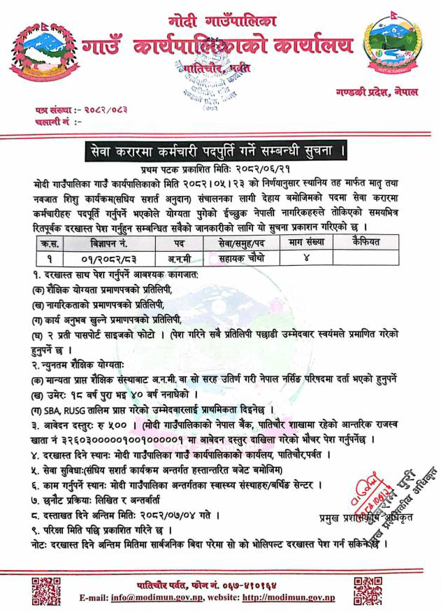 ANM Full Time Parbat Posted 1 week ago Closes: October 28, 2025 Website Modi Gaunpalika JOB OPPORTUNITY Position: ANM Required No.: 4 Location: Parbat Modi Gaunpalika Tagged as: Parbat