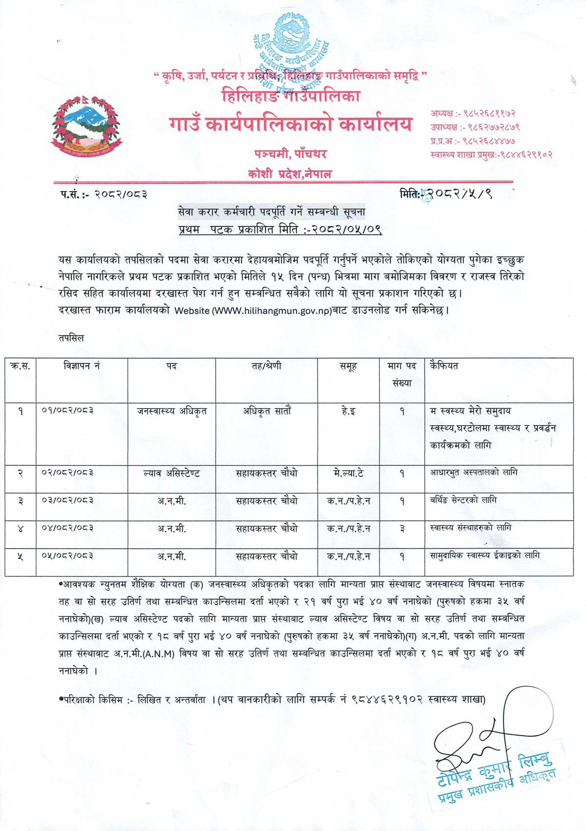 ANM, Lab Assistant, Public Health Officer Full Time Panchthar Posted 1 month ago Applications have closed Website Hilihang Gaunpalika JOB OPPORTUNITY Tagged as: Panchthar