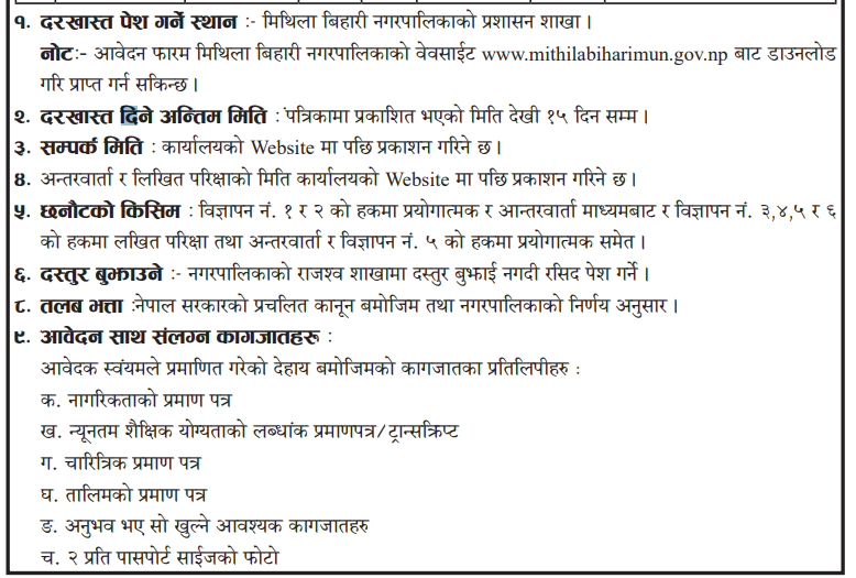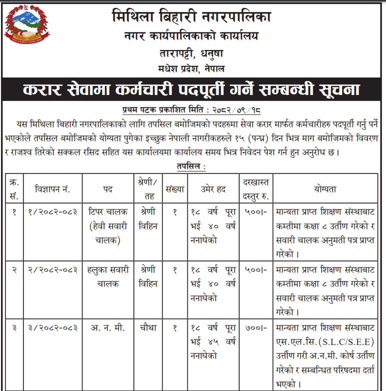 ANM, Psychosocial Counselor, Baidya, Public Health Officer, Light Vehicle Driver, Tipper Driver