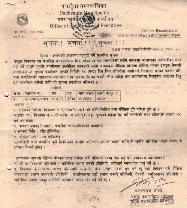 ANM Full Time Bara Posted 2 months ago Applications have closed Website Pachrauta Nagarpalika JOB OPPORTUNITY Position: ANM No. of Vacancy: 4 Location: Bara Pachrauta Nagarpalika Tagged as: Bara