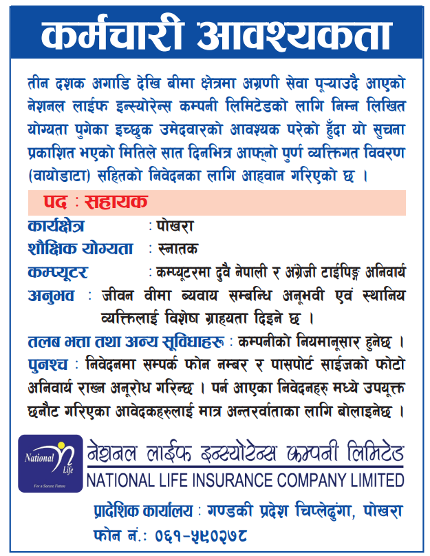 Assistant Full Time Pokhara Posted 1 month ago Applications have closed Website National Life Insurance Company Limited JOB OPPORTUNITY Source: Samadhan News, 28 August, 2025 Tagged as: Pokhara