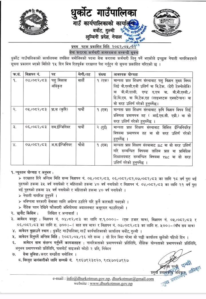 Assistant Sub Engineer, Sub Engineer, Animal Development Officer Full Time Gulmi Posted 1 month ago Applications have closed Website Dhurkot Gaunaplika JOB OPPORTUNITY Tagged as: Gulmi