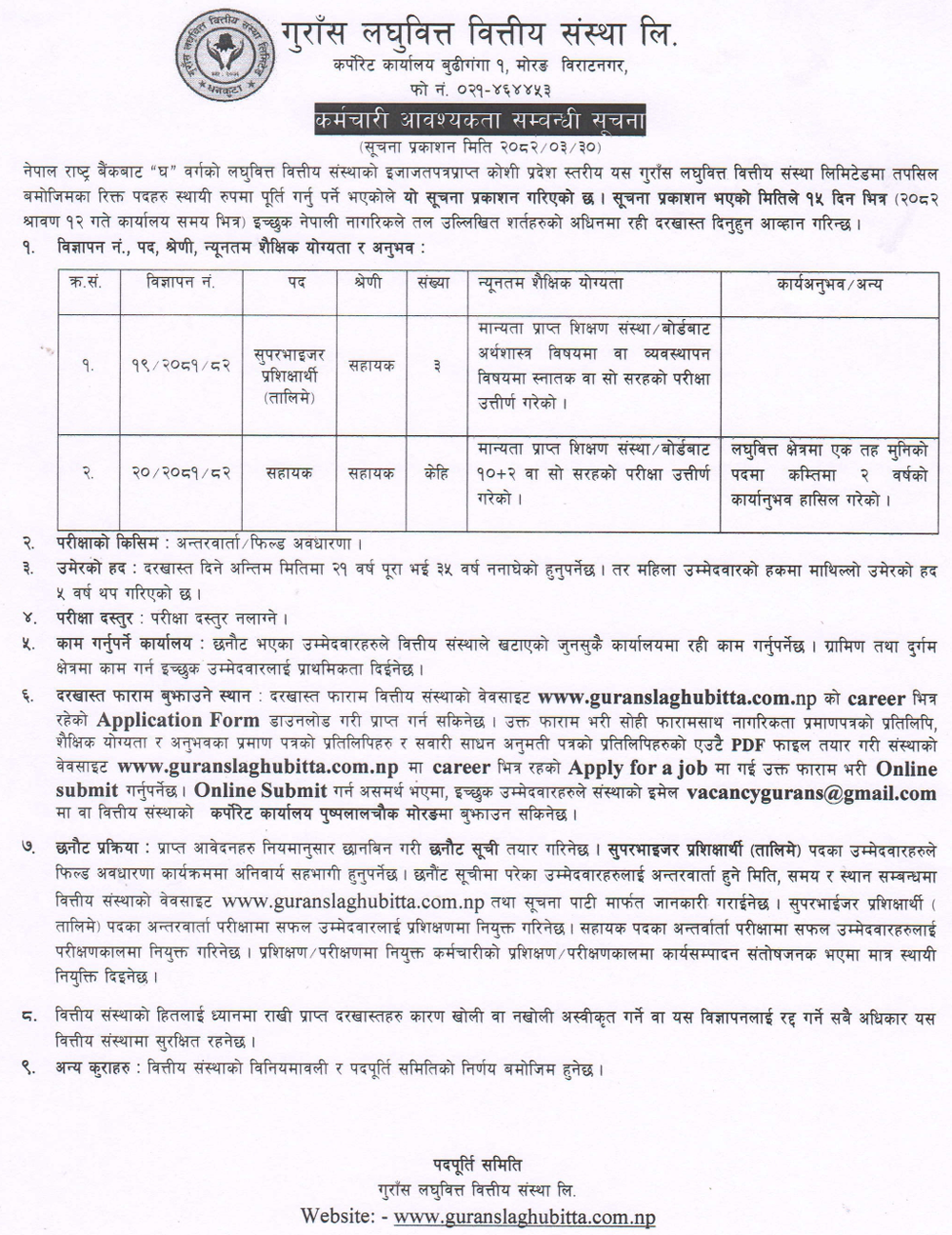 Assistant, Supervisor Trainee Fresher Full Time Anywhere Posted 3 months ago Applications have closed Website Gurans Laghubitta Bittiya Sanstha Limited JOB OPPORTUNITY