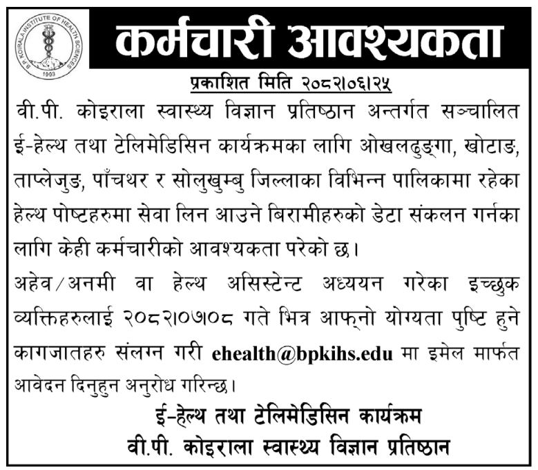 AHW/ANM/Health Assistant Full Time Okhaldhunga, khotang, Solukhumbu Posted 1 week ago Closes: October 25, 2025 Website B.P. Koirala Institute of Health Sciences JOB OPPORTUNITY Source: Kantipur Dainik, 11 October, 2025 Tagged as: Khotang, Okhaldhunga, Solukhumbu Full name Email address Position Apply For Cover Letter/Message Upload CV Upload your CV/resume or any other relevant file. Max. file size: 40 MB. I accept the Terms and Conditions.