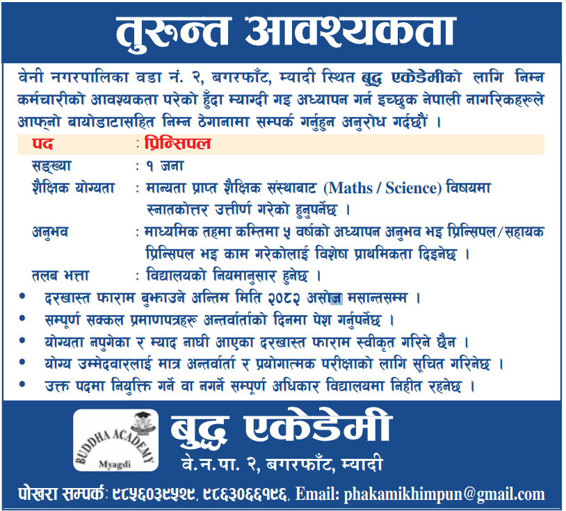 Principal Full Time Pokhara Posted 5 days ago Closes: October 17, 2025 Buddha Academy JOB OPPORTUNITY Position: Principal Location: Myagdi Buddha Academy Phone No.: 9856039529, 9863066196 Email:phakamikhimpun@gmail.com Source: Samadhan News, 28 September, 2025 Tagged as: Pokhara