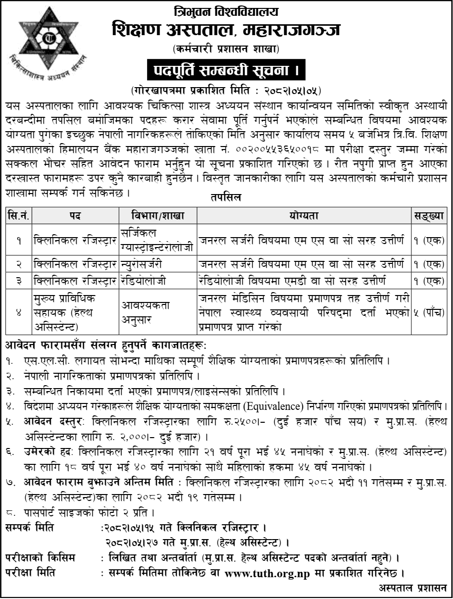 Chief Technical Assistant (Health Assistant), Clinical Registrar Full Time Kathmandu Posted 1 month ago Applications have closed Website TU Teaching Hospital JOB OPPORTUNITY Source: Gorkhapatra, 21 August, 2025 Tagged as: Kathmandu