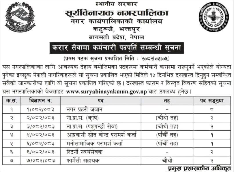 City Police Constable, Pharmacy Assistant, Psychosocial Counselor, Returnee Volunteer Full Time Bhaktapur Posted 2 months ago Applications have closed Website Suryabinayak Nagarpalika JOB OPPORTUNITY Source: Nepal Samachar Patra, 21 August, 2025