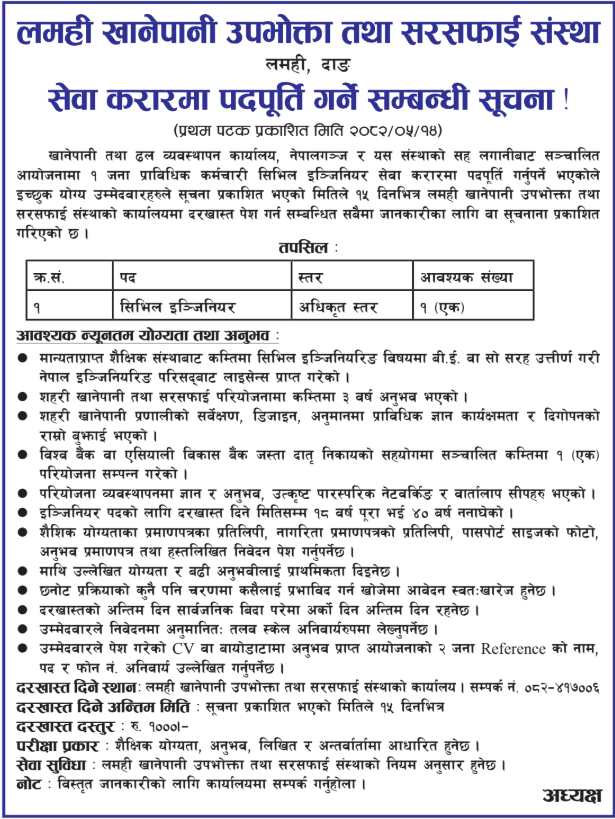 Civil Engineer Full Time Dang Posted 1 month ago Applications have closed Lamahi Drinking Water Supply Institution JOB OPPORTUNITY Position: Civil Engineer No. of Vacancy:1 Location: Lamahi, Dang Lamahi Drinking Water Supply Institution Phone No.: 082-417006 Source: Butwal Today, 30 August, 2025 Tagged as: Dang
