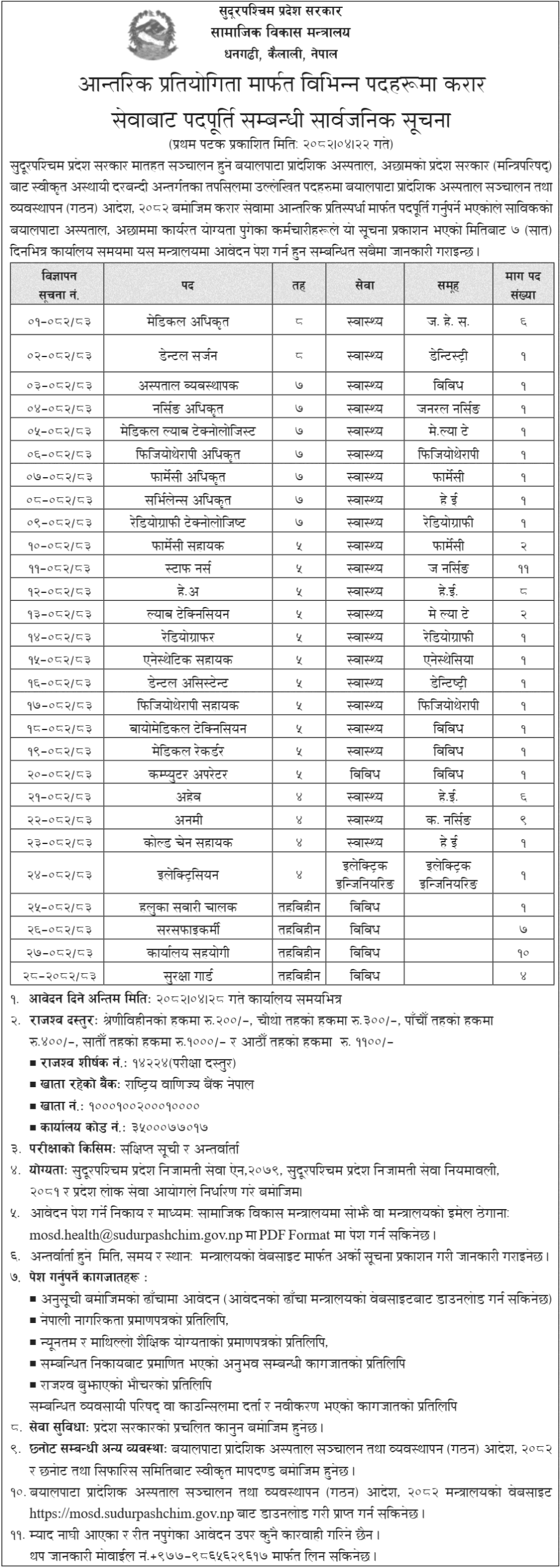 Computer Operator, Cold Chain Assistant, Health Assistant, ANM, AHW, Nursing Officer, Physiotherapy Officer, Pharmacy Officer, Surveillance Officer, Radiography Technologist, Pharmacy Assistant, Staff Nurse, Health Assistant, Lab Technician