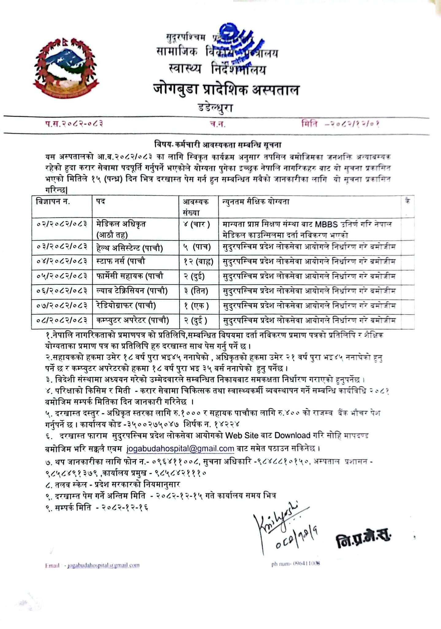 Computer Operator, Radiographer, Lab Technician, Pharmacy Assistant, Staff Nurse, Health Assistant, Medical Officer