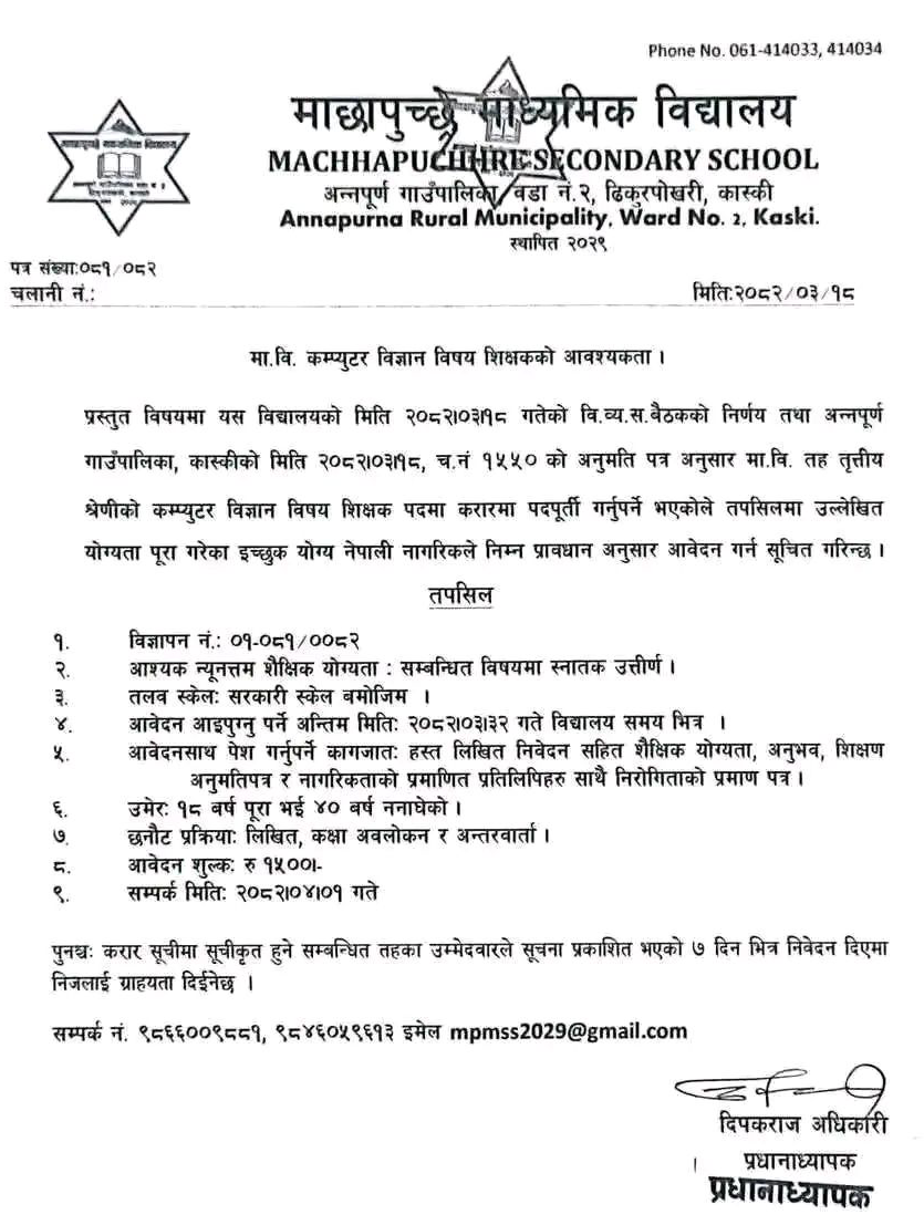 Computer Science Teacher Full Time Kaski Posted 3 months ago Applications have closed Machhapuchhre Madhyamik Vidyalaya JOB OPPORTUNITY Tagged as: Kaski