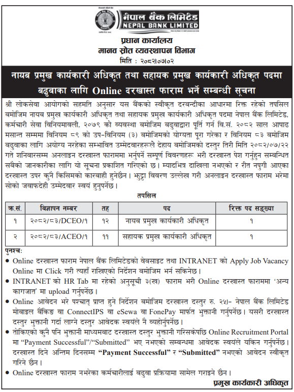 Deputy Chief Executive Officer, Assistant Chief Executive Officer Full Time Anywhere Posted 4 days ago Closes: November 8, 2025 Website Nepal Bank Limited JOB OPPORTUNITY Source: Gorkhapatra, 19 October, 2025