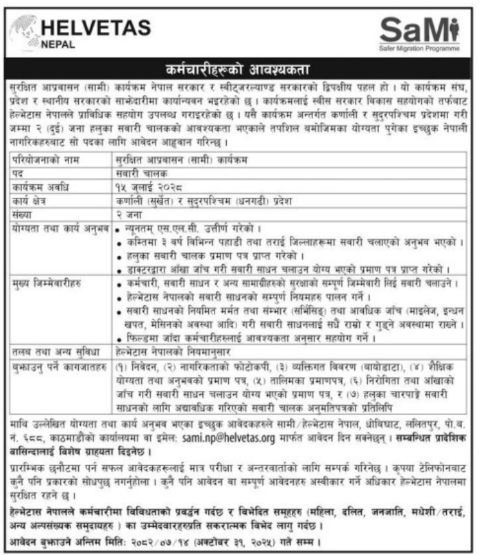 Driver Full Time Dhangadhi, Surkhet Posted 1 week ago Closes: October 31, 2025 Website Helvetas Nepal JOB OPPORTUNITY Source: Kantipur Dainik, 14 October, 2025 Tagged as: Dhangadhi, Surkhet