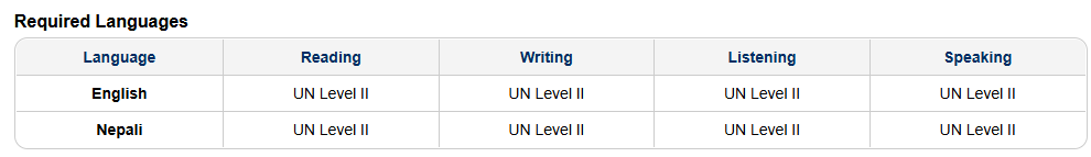 English and French are the working languages of the United Nations Secretariat. For this job opening, English is required. Nepali is required. The table below shows the minimum required level for each skill in these languages, according to the UN Language Framework (please consult https://languages.un.org for details).