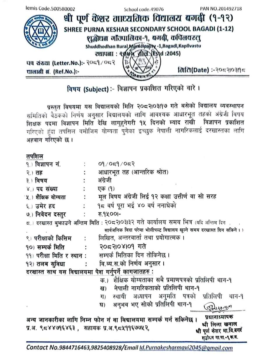 English Teacher Full Time Kapilvastu Posted 3 months ago Applications have closed Shree Purna Keshar Madhyamik Vidyalaya JOB OPPORTUNITY Tagged as: Lalitpur
