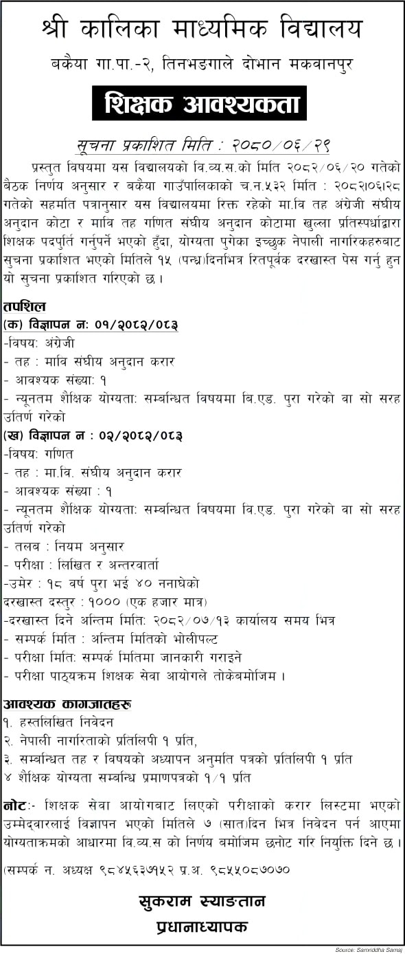 English Teacher Full Time Makwanpur Posted 6 days ago Closes: October 30, 2025 Shree Kalika Madhyamik Vidyalaya JOB OPPORTUNITY Position: Teacher Subject: English Level: Secondary Location: Makwanpur Shree Kalika Madhyamik Vidyalaya Phone No.: 9845637152, 9855087070 Tagged as: Makwanpur