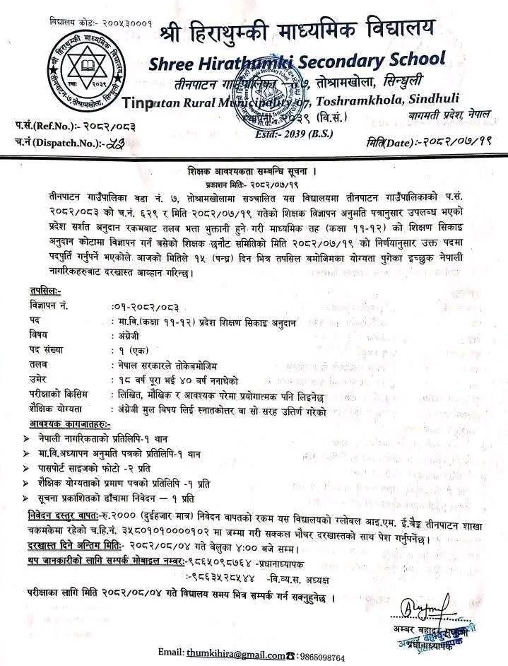 English Teacher Full Time Sindhuli Posted 6 days ago Closes: November 20, 2025 Shree Hirathumki Madhyamik Vidyalaya JOB OPPORTUNITY Position: Teacher Level: Secondary Subject: English No. of Vacancy: 1 Location: Sindhuli Shree Hirathumki Madhyamik Vidyalaya Phone No.: 9865098764, 9863528544 Tagged as: Sindhuli