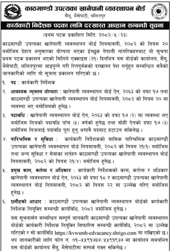 Executive Director Full Time Kathmandu Posted 4 weeks ago Applications have closed Website Kathmandu Upatyaka Khanepani Limited JOB OPPORTUNITY Source: Gorkhapatra, 8 September, 2025 Tagged as: Kathmandu