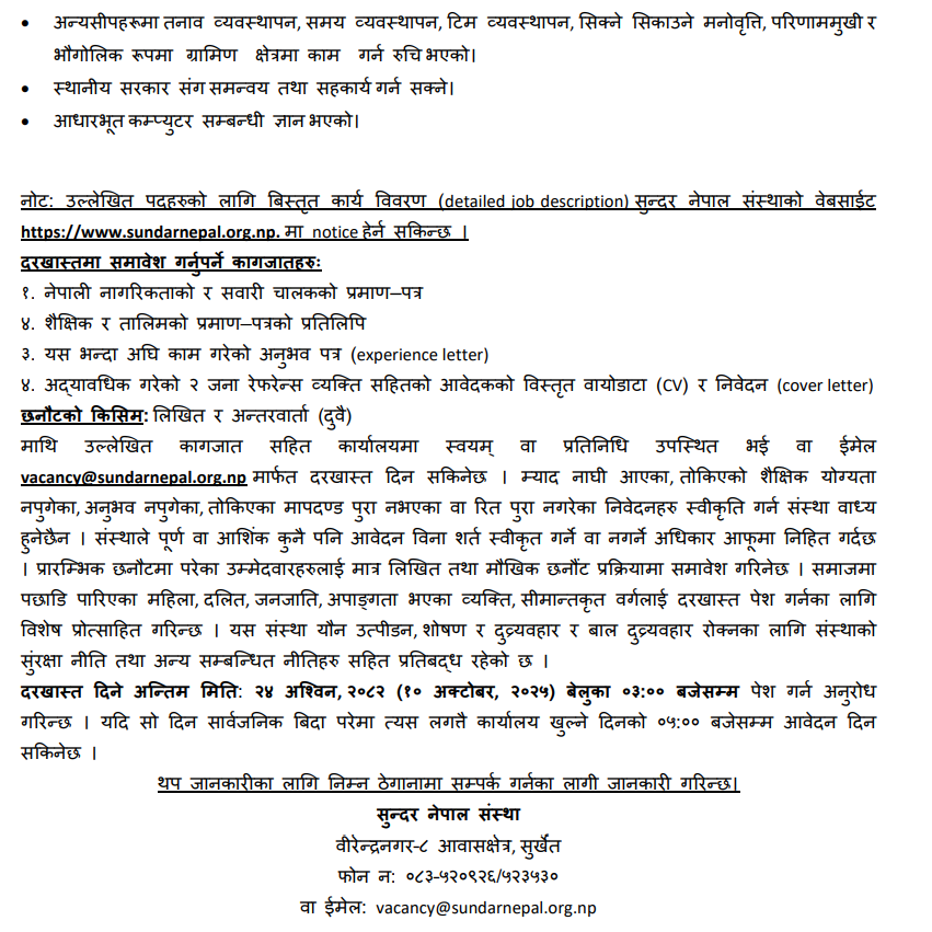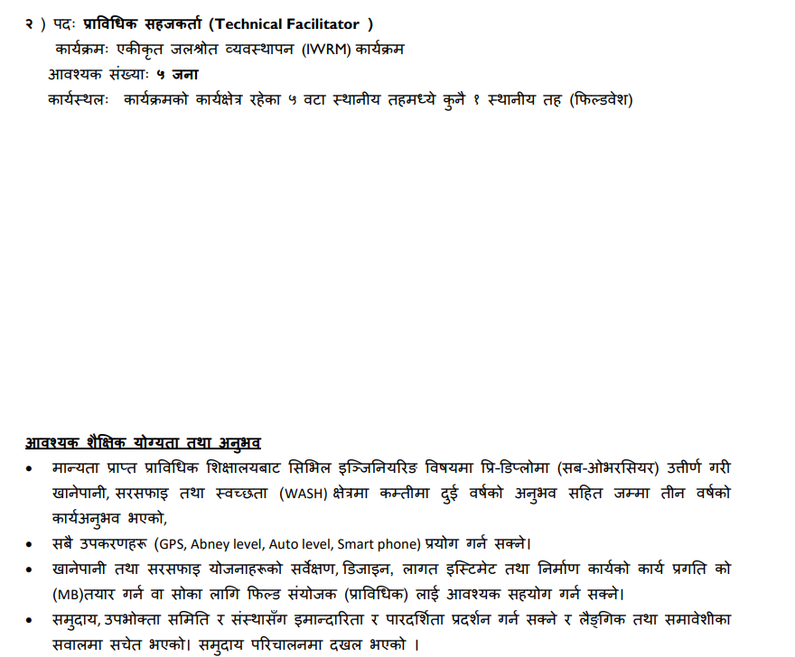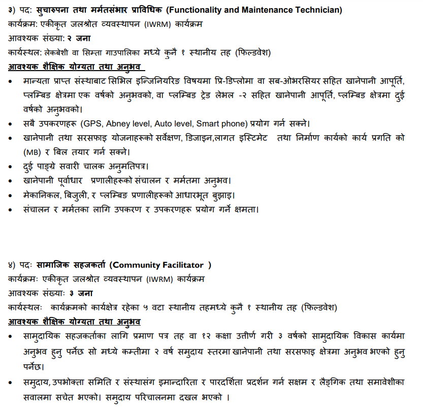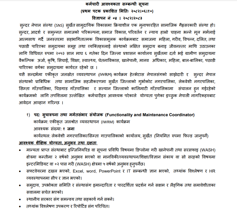Functionality and Maintenance Coordinator, Technical Facilitator, Community Facilitator, Functionality and Maintenance Technician Full Time Anywhere Posted 2 days ago Closes: October 10, 2025 Website Sundar Nepal JOB OPPORTUNITY