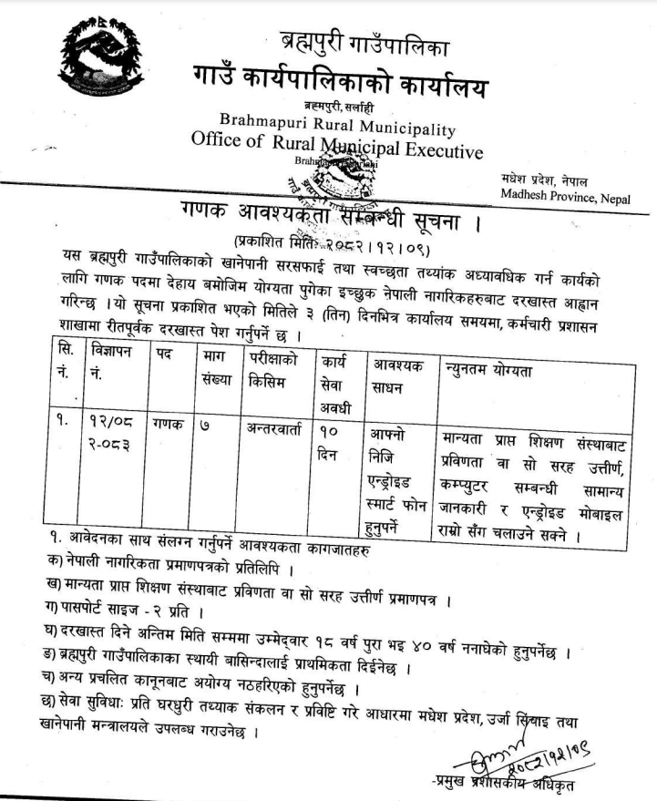 Ganak Full Time Siraha Posted 1 week ago Applications have closed Website Brahmapuri Gaunpalika JOB OPPORTUNITY Position: Ganak No of Vacancy: 7 Location: Siraha Brahmapuri Gaunpalika Tagged as: Siraha