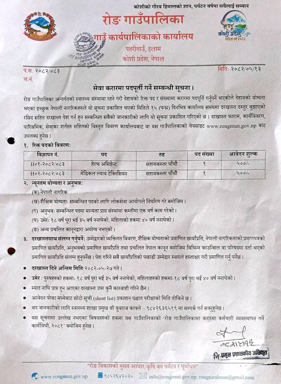 Health Assistant, Medical Lab Technician Full Time Ilam Posted 1 month ago Applications have closed Website Rong Gaunpalika JOB OPPORTUNITY Position: Health Assistant No. of Vacancy: 1 Position: Medical Lab Technician No. of Vacancy: 1 Location: Ilam Rong Gaunpalika Phone No.: 9842636519 Tagged as: Ilam