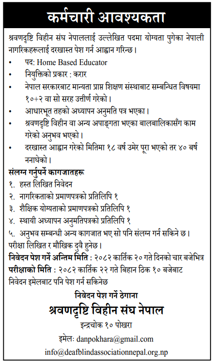 Home Based Educator Full Time Pokhara Posted 2 weeks ago Applications have closed Deafblind Association Nepal JOB OPPORTUNITY Tagged as: Pokhara