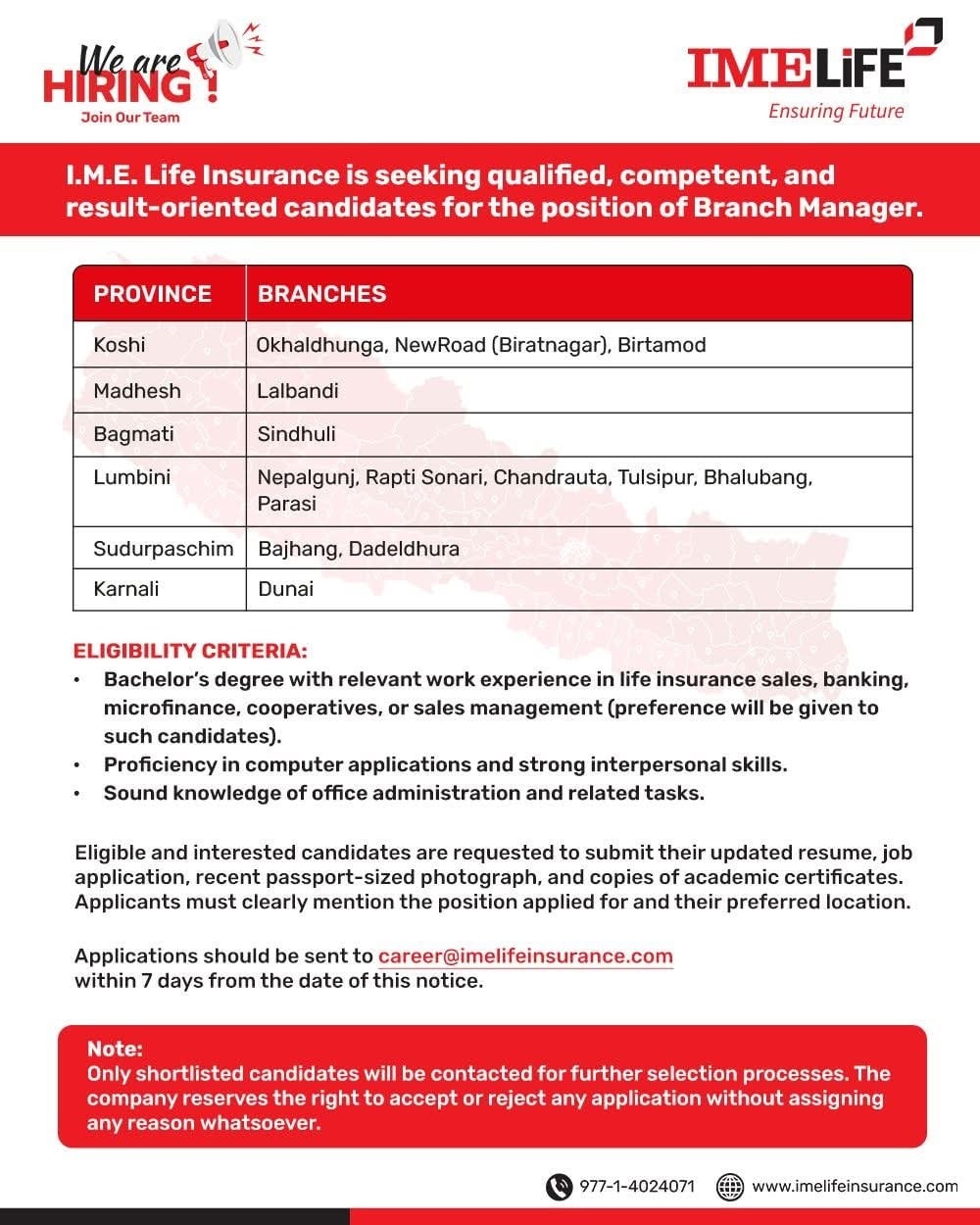 Applications should be sent to career@imelifeinsurance.com within 7 days from the date of this notice.