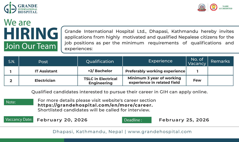 Grande International Hospital Ltd., Dhapasi, Kathmandu hereby invites applications from highly motivated and qualified Nepalese citizens for the job positions as per the minimum requirements of qualifications and experiences: