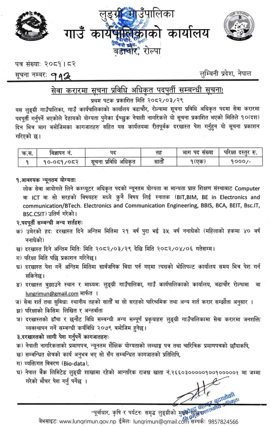 IT Officer Full Time Rolpa Posted 3 months ago Applications have closed Website Lungri Gaunpalika JOB OPPORTUNITY Position: IT Officer No. of Vacancy: 1 Location: Rolpa Lungri Gaunpalika Tagged as: Rolpa