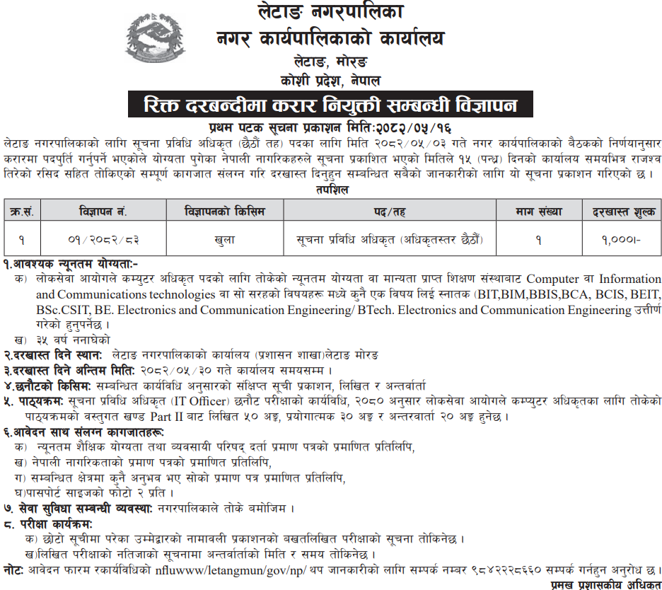 IT Officer Full Time Morang Posted 1 month ago Applications have closed Website Letang Nagarpalika JOB OPPORTUNITY Position: IT Officer No. of Vacancy: 1 Location: Morang Letang Nagarpalika Website: www.letangmun.gov.np/ Phone No: 984228660 Tagged as: Morang