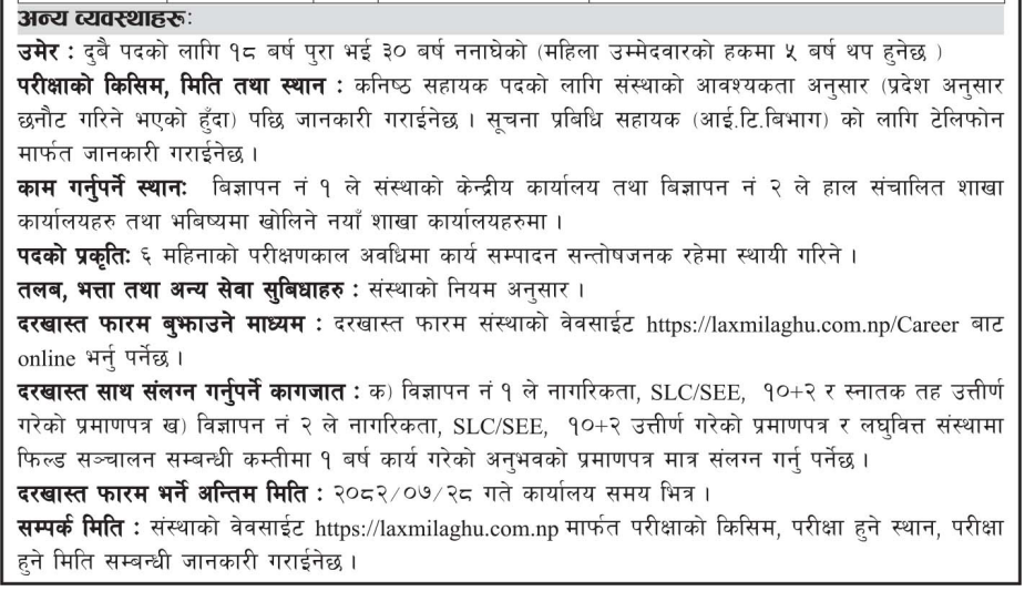 Junior Assistant, IT Assistant Full Time Anywhere Posted 3 weeks ago Applications have closed Website Laxmi Laghubitta Bittiya Sanstha Limited JOB OPPORTUNITY Position: IT Assistant Required No. : 1 Position: Junior Assistant Required No. : Few Source: Nepal Samachar Patra, 30 October, 2025
