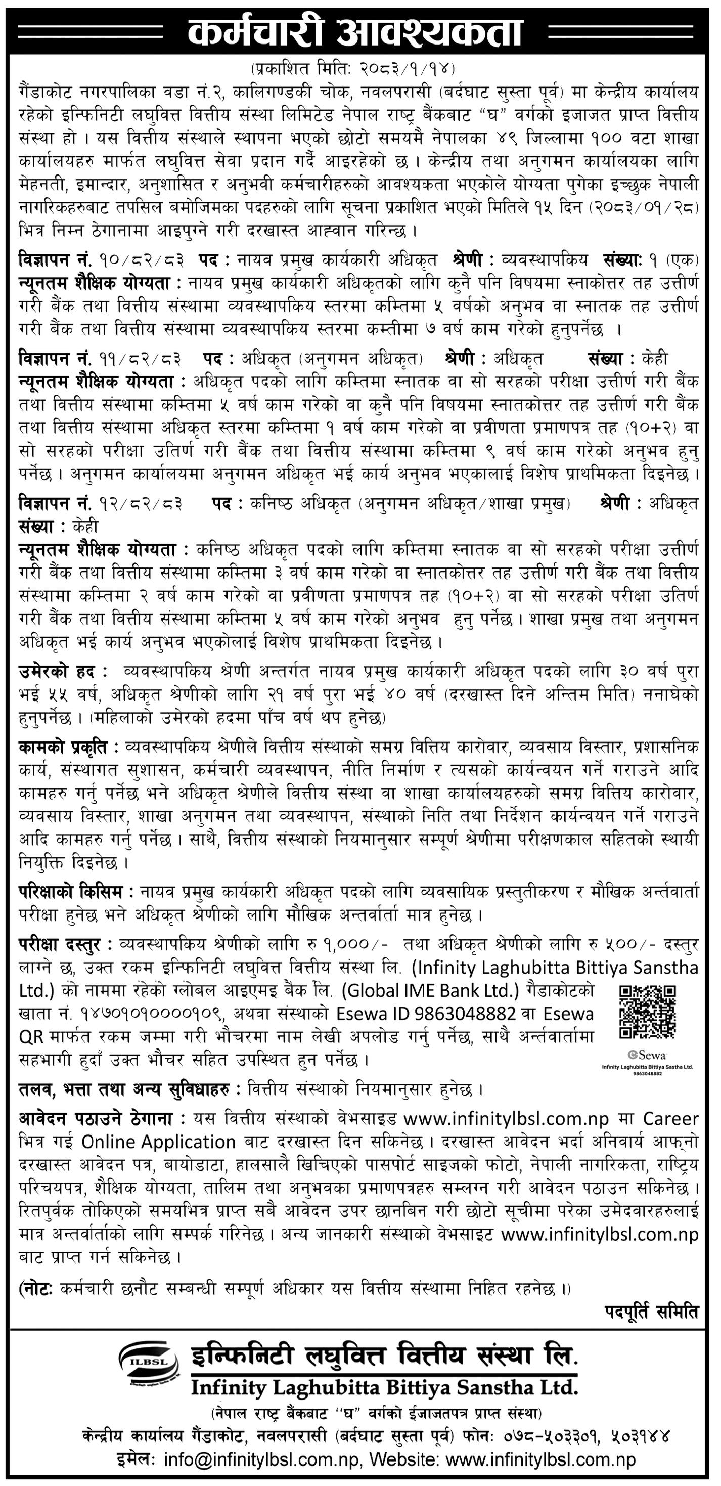Junior Officer, Officer, Deputy Chief Executive Officer Full Time Anywhere Posted 2 days ago Closes: May 11, 2026 Website Infinity Laghubitta Bittiya Sanstha Ltd. JOB OPPORTUNITY To apply for this job please visit infinity.rigojobs.com.