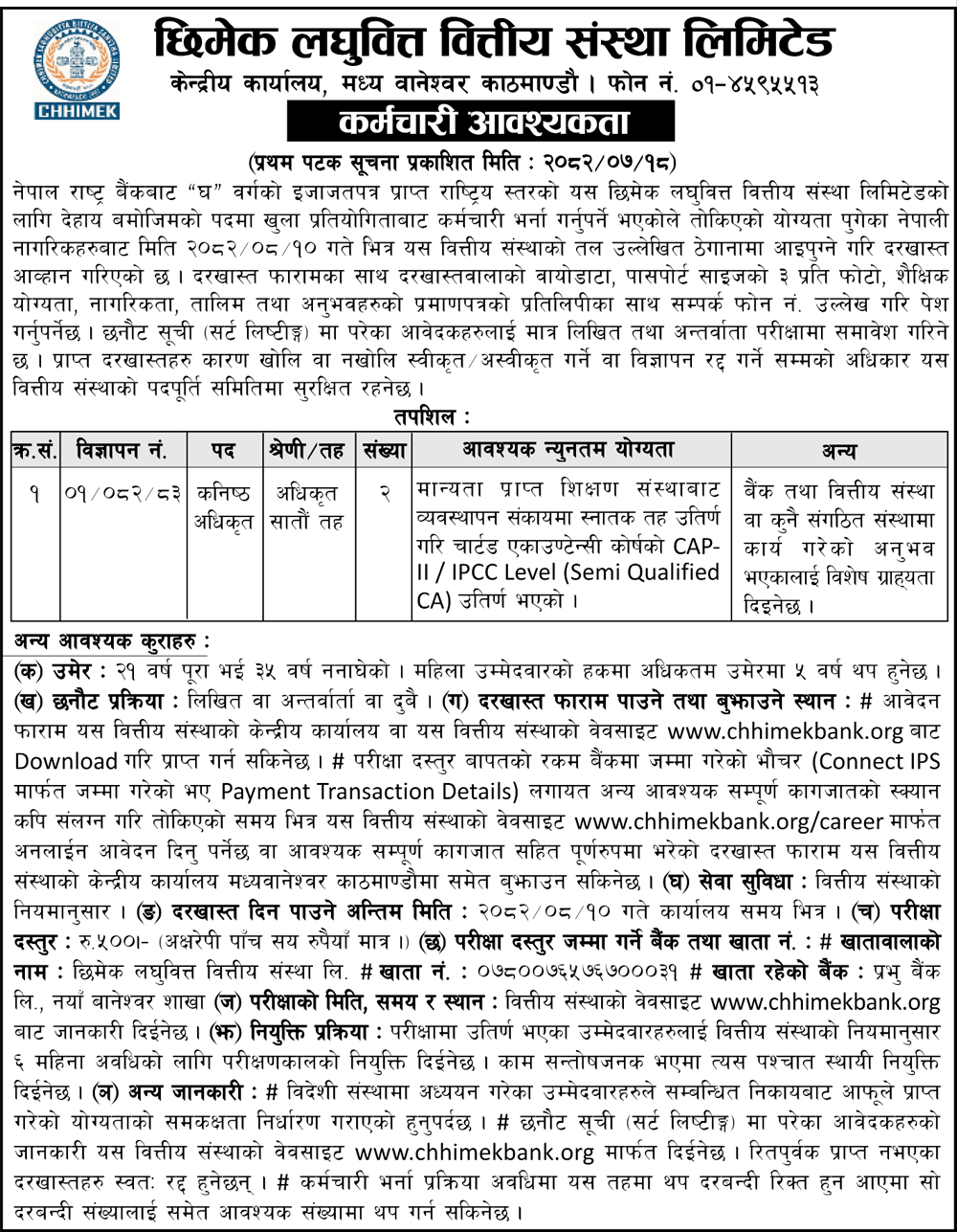 Junior Officer Full Time Anywhere Posted 2 weeks ago Closes: November 24, 2025 Website Chhimek Laghubitta Bittiya Sanstha Ltd. JOB OPPORTUNITY Position: Junior Officer No. of Vacancy: 2 Chhimek Laghubitta Bittiya Sanstha Ltd. To apply for this job please visit www.chhimekbank.org.