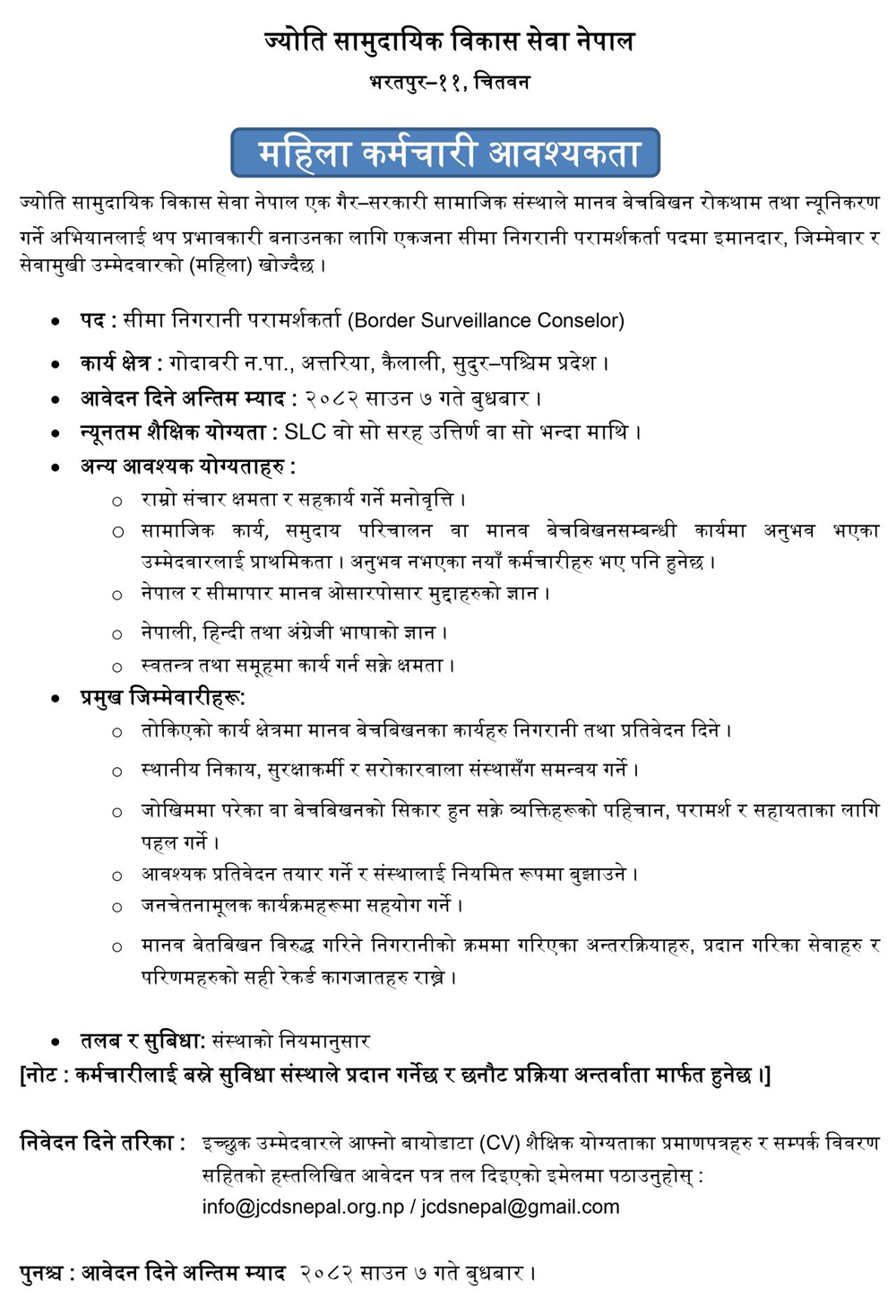Border Surveillance Counselor Full Time Kailali Posted 2 months ago Applications have closed Website Jyoti Community Development Service Nepal JOB OPPORTUNITY Tagged as: Kailali
