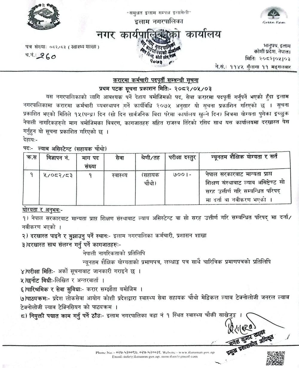 Lab Assistant Full Time Ilam Posted 1 month ago Applications have closed Website Ilam Nagarpalika JOB OPPORTUNITY Position: Lab Assistant No. of Vacancy: 1 Location: Ilam Ilam Nagarpalika Tagged as: Ilam