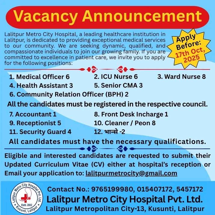 Lalitpur Metro City Hospital, a leading healthcare institution in Lalitpur, is dedicated to providing exceptional medical services to our community. We are seeking dynamic, qualified, and compassionate individuals to join our growing family. If you are committed to excellence in patient care, we invite you to apply for the following positions