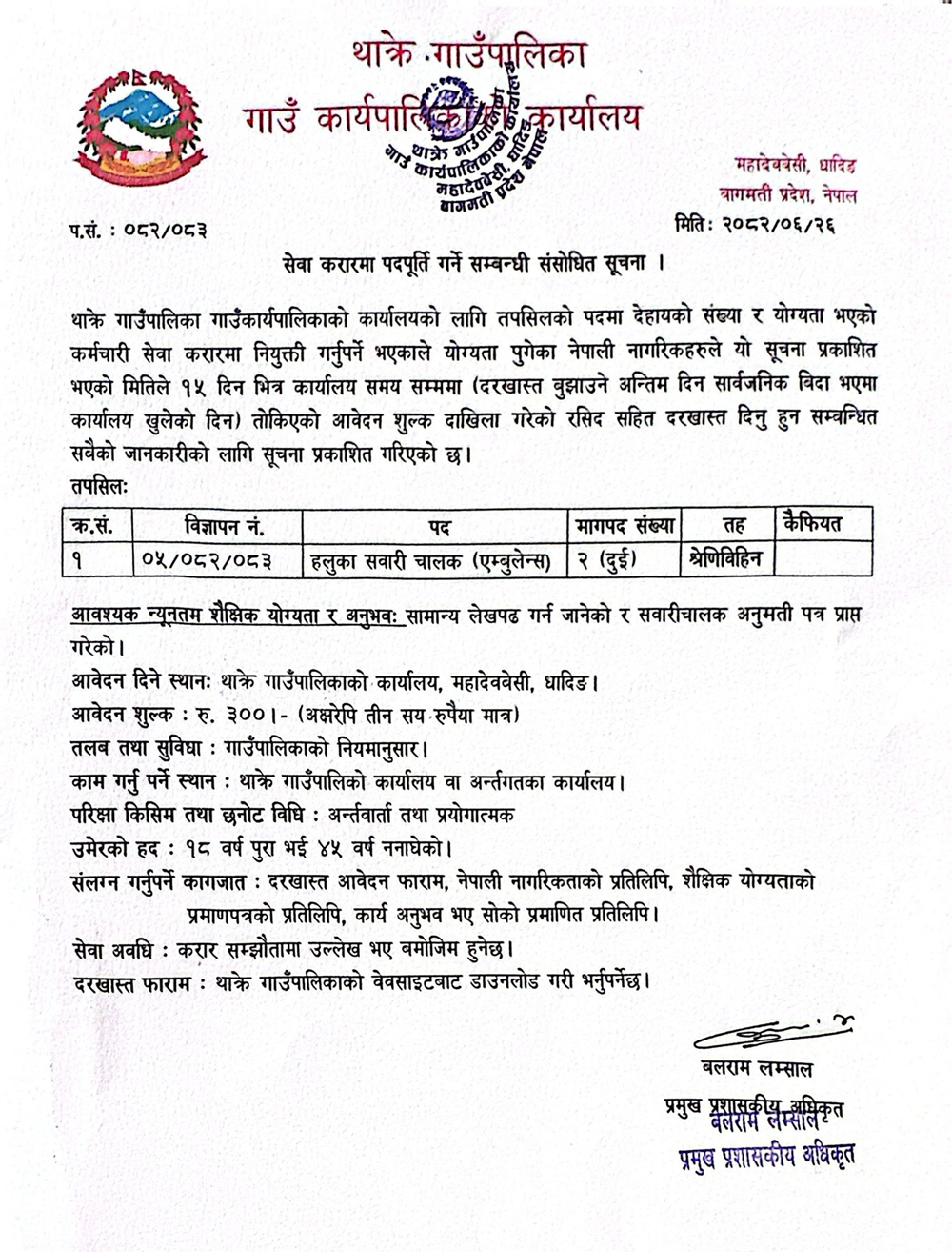 Light Vehicle Driver Full Time Dhading Posted 1 week ago Closes: October 26, 2025 Website Thakre Gaunpalika JOB OPPORTUNITY Position: Light Vehicle Driver No. of Vacancy: 2 Location: Dhading Thakre Gaunpalika Tagged as: Dhading