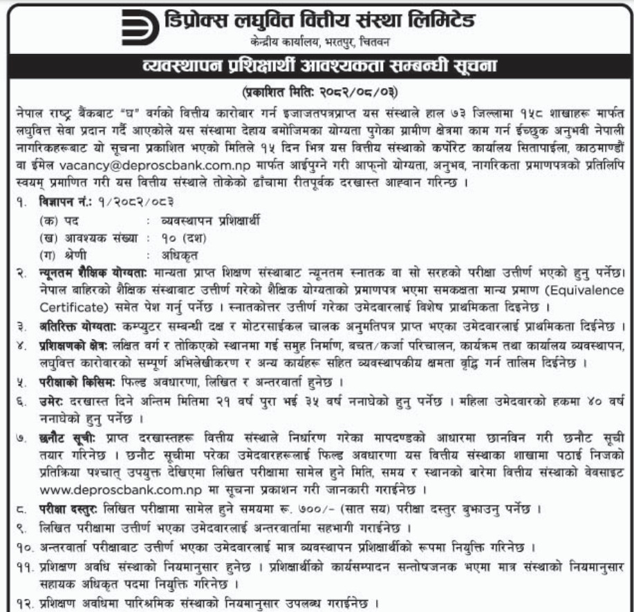 Management Trainee – 10 Vacancies Full Time Anywhere Posted 2 weeks ago Applications have closed Website Deprosc Laghubitta Bittiya Sanstha Limited JOB OPPORTUNITY