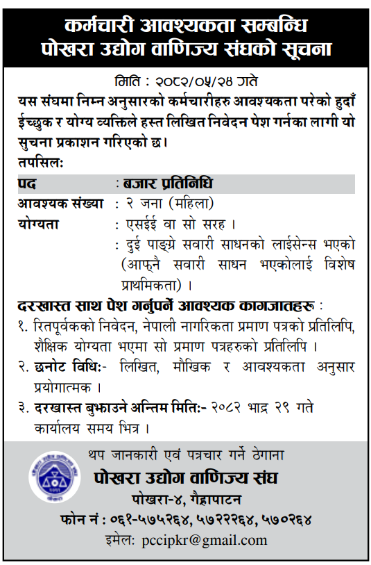 Market Representative Full Time Pokhara Posted 3 weeks ago Applications have closed Pokhara Chamber of Commerce and Industry JOB OPPORTUNITY Position: Market Representative No. of Vacancy: 2 Location: Pokhara Pokhara Chamber of Commerce and Industry Phone No.: 061575264, 5722264, 570264 Email: pccipkr@gmail.com Tagged as: Pokhara
