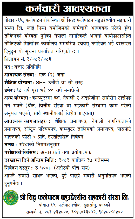 Market Representative Full Time Pokhara Posted 3 weeks ago Applications have closed Shree Siddha Falepatan Multipurpose Cooperative Ltd. JOB OPPORTUNITY Position: Market Representative No. of Vacancy: 1 Location: Pokhara Shree Siddha Falepatan Multipurpose Cooperative Ltd. Phone No.: 061-434600, 9846033052, 9846088400 Tagged as: Pokhara
