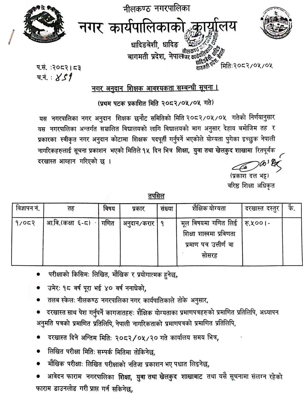 Math Teacher Full Time Dhading Posted 1 month ago Applications have closed Website Nilkantha Nagarpalika JOB OPPORTUNITY Position: Teacher No. of Vacancy: 1 Subject: Math Location: Dhading Nilkantha Nagarpalika Email: edu.neelakanthamun@gmail.com