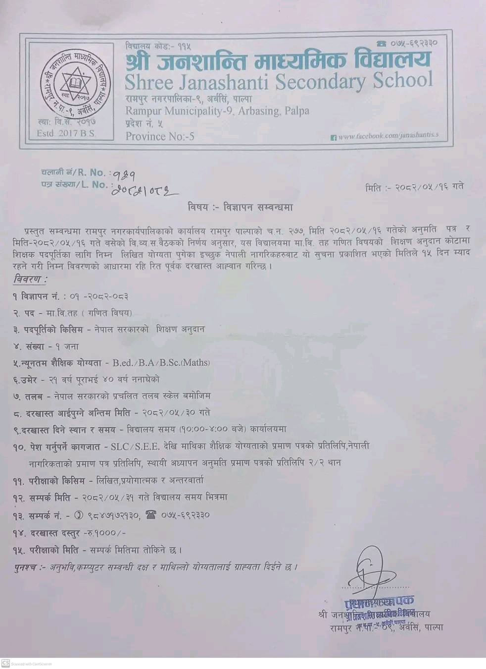 Math Teacher Full Time Palpa Posted 1 month ago Applications have closed Shree Janashanti Madhyamik Vidyalaya JOB OPPORTUNITY Position: Teacher Subject: Math Level: Secondary Location: Palpa Shree Janashanti Madhyamik Vidyalaya Phone No.: 9847172130, 075-692330 Tagged as: Palpa
